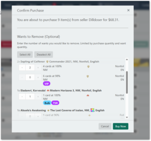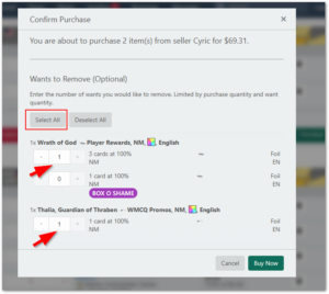 If you have multiple Wants matching one of the items being purchased, they are presented to you just as you would expect on the Wants page, which means they will be separated by differences, such as limit, tag, offer %, etc., and user may choose which Want to remove by modifying the quantity field for each item.