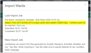 Huzzah! Also, an important note about the image above is that the single failure seen in the screenshot was actually a problem with a mismatched Scryfall ID in our database. So after correcting that, the CSV imports with 0 failures!