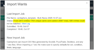 Today, we pushed a long-awaited update that delivers a massive improvement to our Wants importer. Like we did back in March with the Haves importer, the Wants import tool now recognizes Scryfall ID to vastly improve the importing of collections from newer collection managers like Manabox, Archidekt, or any other application that includes a Scryfall ID with the card.