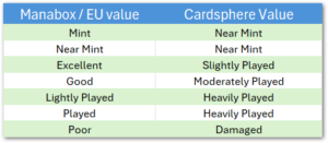 Manabox support is a frequent ask of us, but applications built outside of the United States, like Manabox, often use Cardmarket/EU standards for condition that were incompatible with Cardsphere.  With this update, we've built in logic to translate those to the Cardsphere equivalent, allowing these collections to be imported seamlessly.  Here's how the conditions translate: