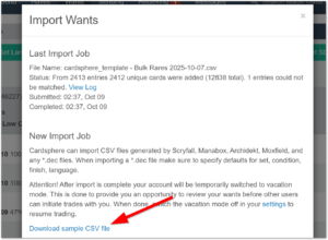On the Import Wants dialogue, the sample CSV has been updated to include the newly expected Scryfall ID field, as well as the offer and limit fields that are often requested by our users. The new sample CSV can be found via the link in the Wants import dialogue or by clicking this link.